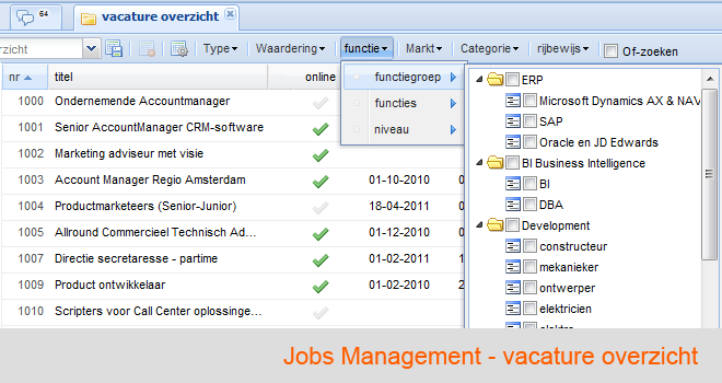 Iedere gebruiker van EazyMatch ziet bij het inloggen gelijk wat de meest recente vacatures zijn. Maar men kan ook snel het volledige aanbod van alle vacatures inzien door eenvoudigweg een overzicht op te vragen. Door vervolgens gebruik te maken van diverse filters, kunt u het overzicht terugbrengen naar enkel relevante vacatures, die overeenkomen met uw filter criteria.